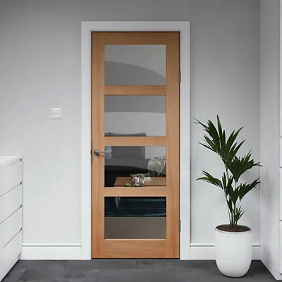 The Shaker 4-panel design is a beautiful, modern oak door created to enhance the look of any room in your home. It will give any room a modern touch with its clean lines. The glazing allows plenty of light to open up small and darker rooms.